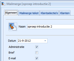 In menu Overzichten – Mailing – Mailmerge kunnen behalve de brieven ook de e-mails worden aangemaakt. Maak met de knop <nieuw> een nieuwe email aan en vink het onderdeel ‘administratie’ en ‘email’ aan zoals hieronder aangegeven.