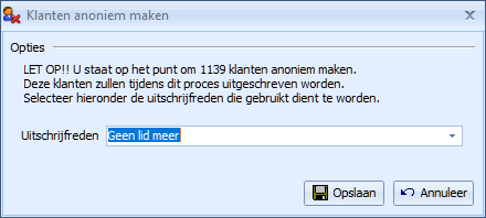 Nadat op de knop Klanten anoniem maken is geklikt wordt er gevraagd om de uitschrijfreden.