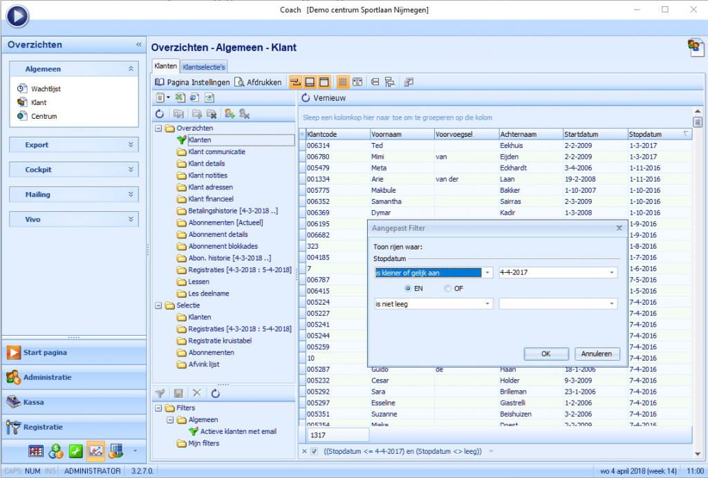 In dit overzicht filteren we de klanten op Stopdatum “is kleiner of gelijk aan” 4-4-2017 en “is niet leeg”.
