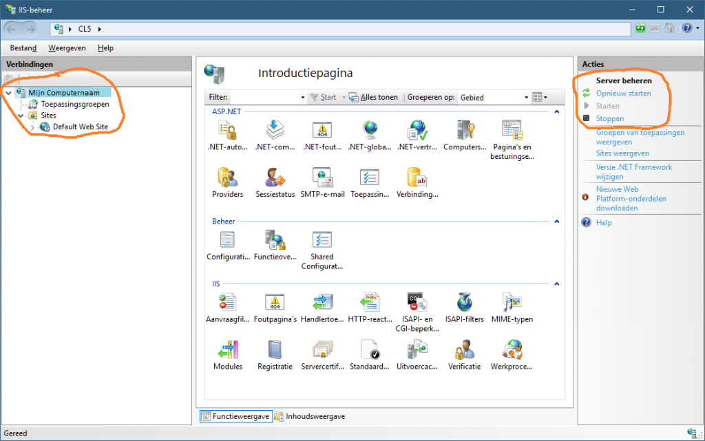 • Ga terug naar het scherm om IIS te beheren en klik op “Starten”.